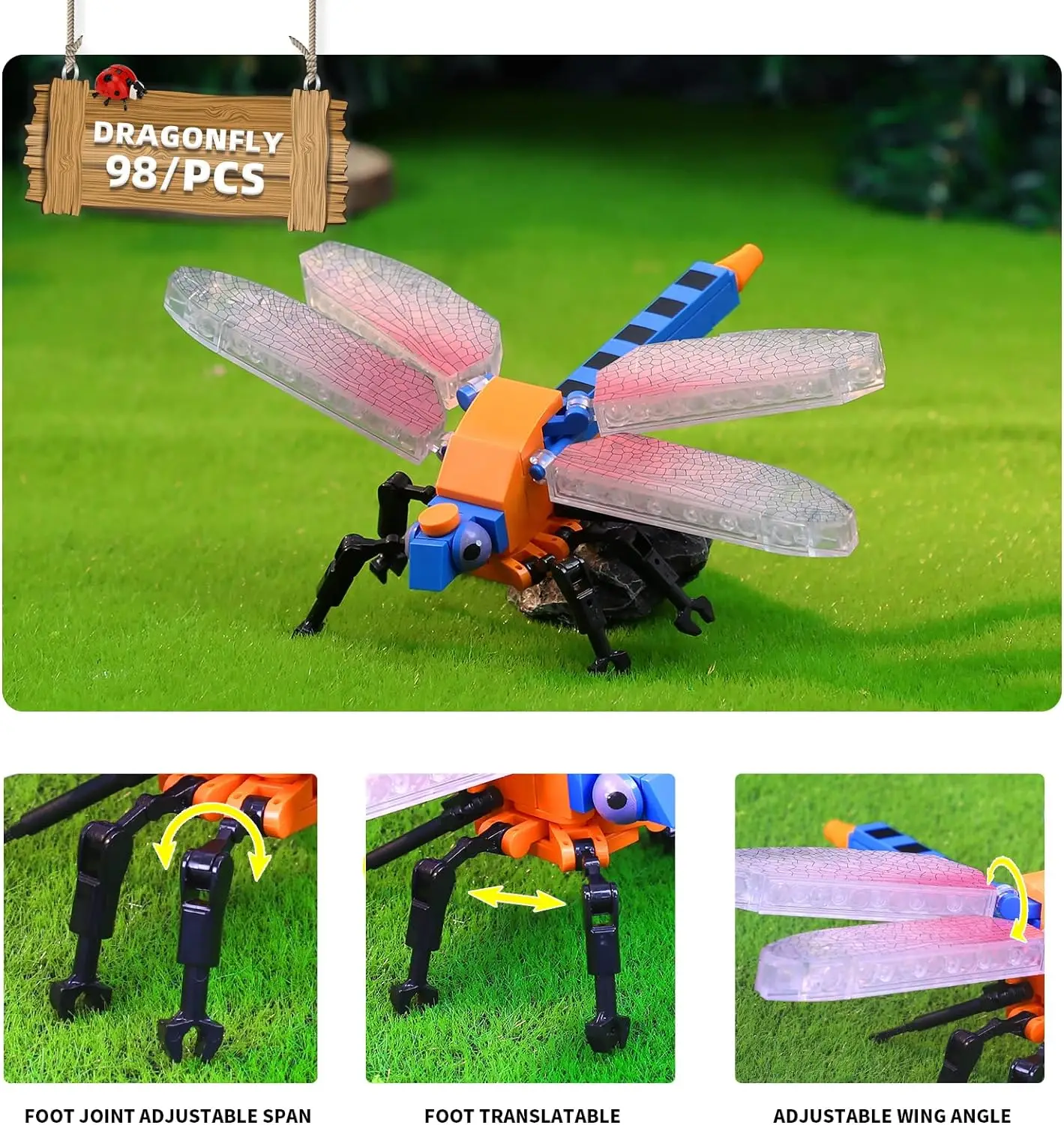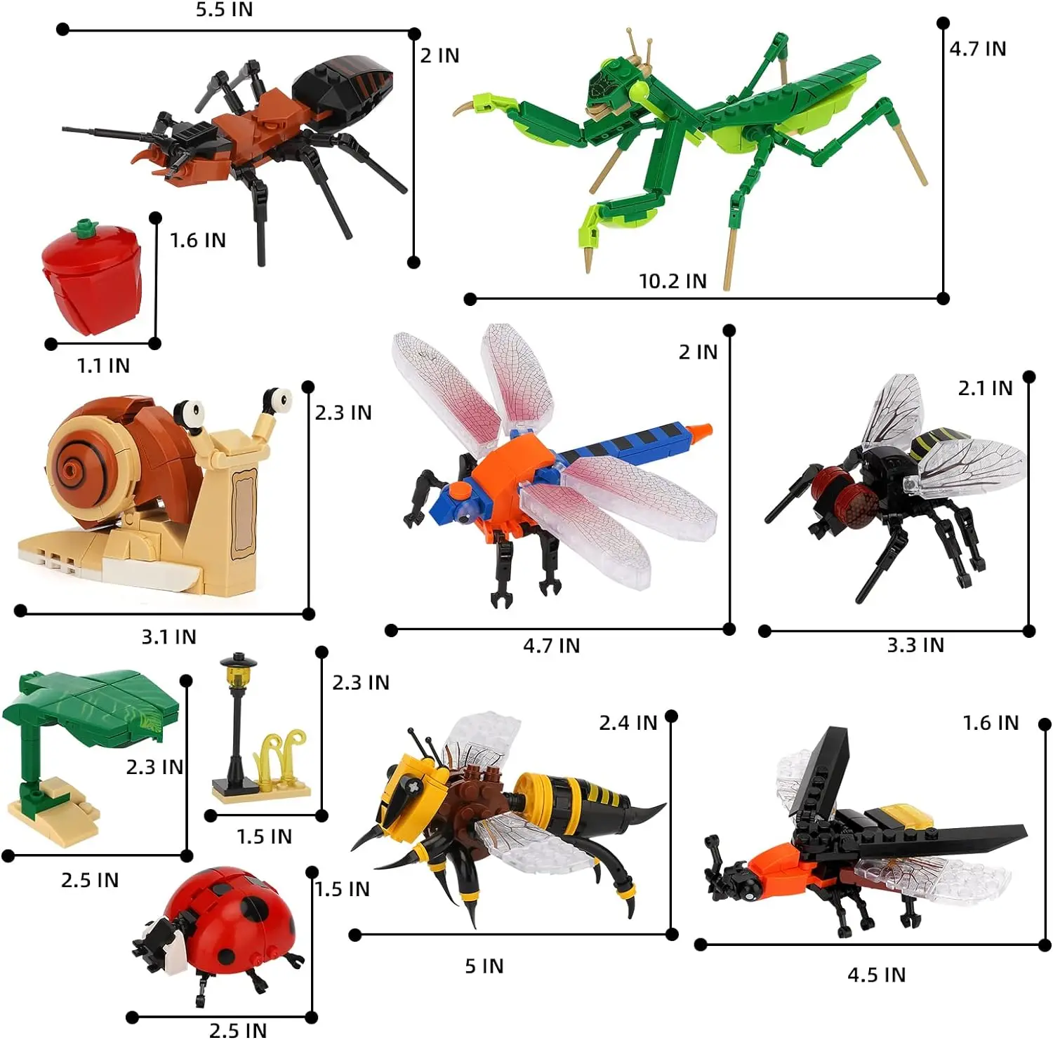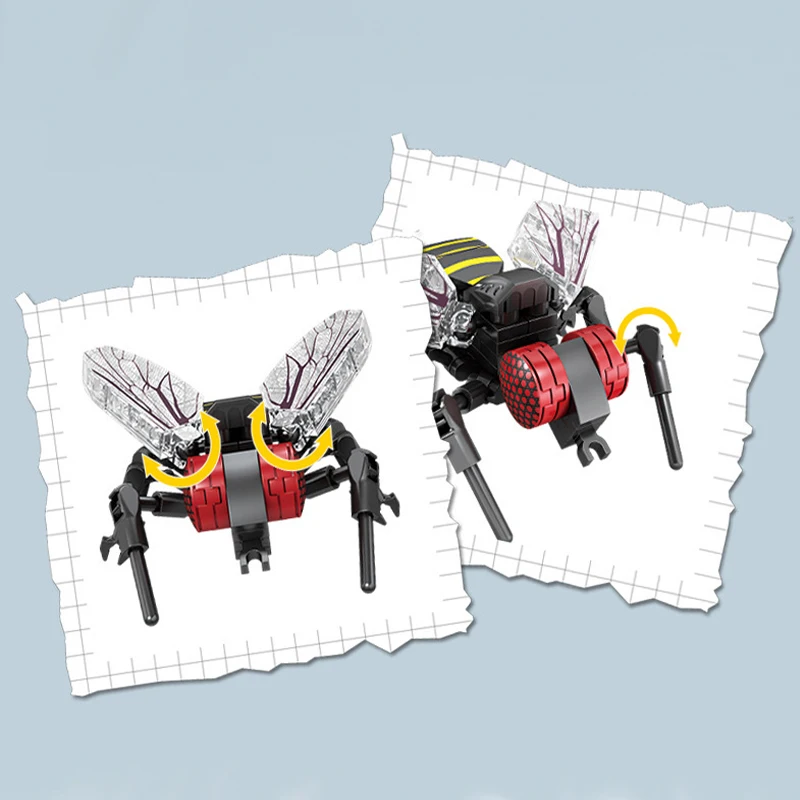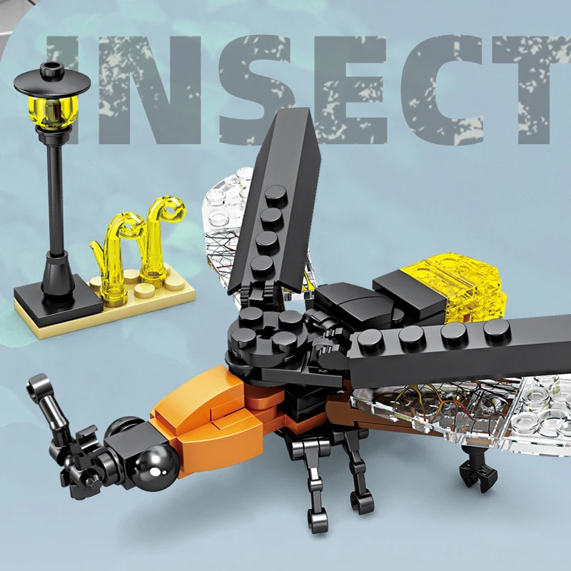 【Product Details】This set of building block toys has a total of 8 different insect toys, mantis 103pcs, flies 74pcs, ants 91pcs, bees 90pcs, dragonflies 98pcs, fireflies 96pcs, ladybugs 73pcs, snails 67, the size of the finished assembly are about 6in.